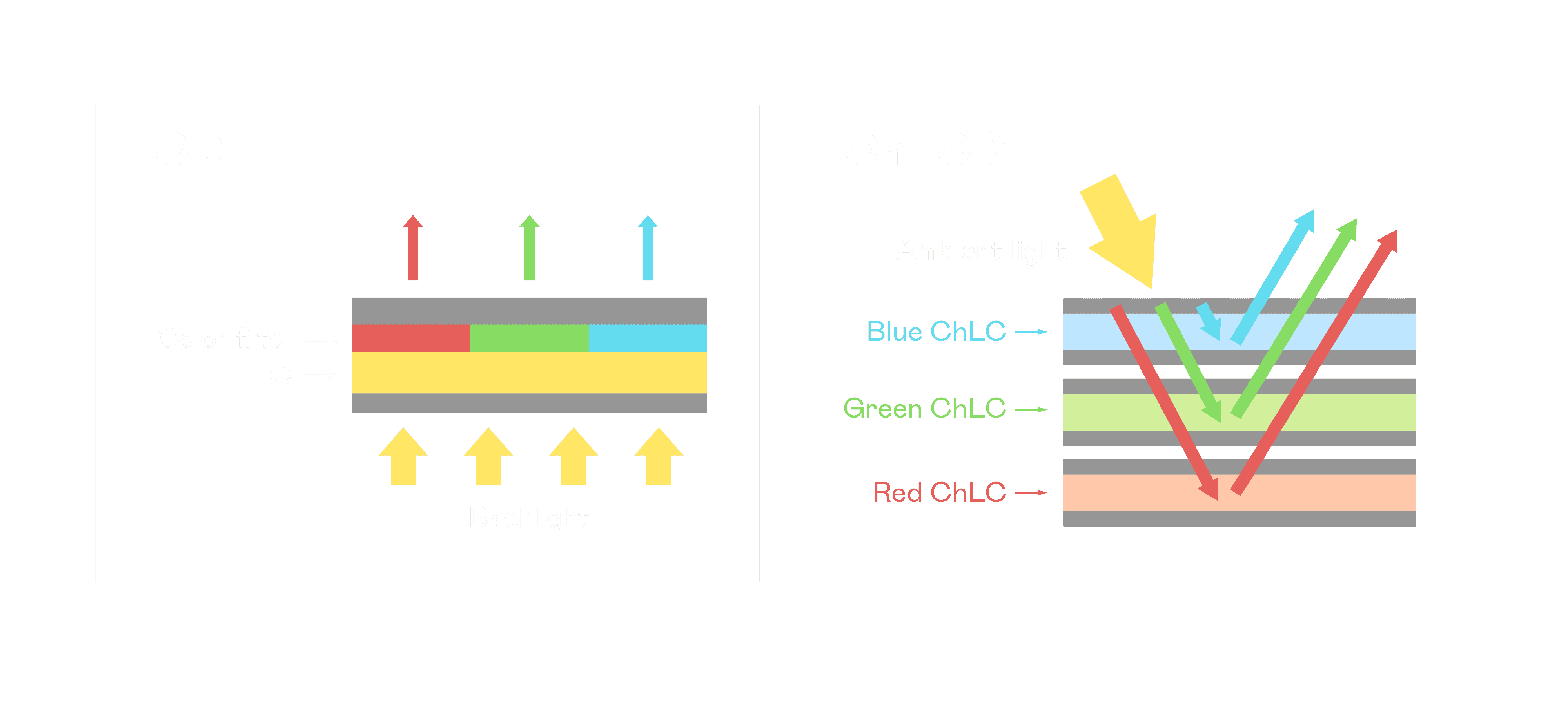 ChLCD 胆固醇液晶就如同纸张一样,,,透过反射环境光来显示影像,,因此长时间观看不易造成人眼视觉疲劳,,,可达到护眼效果。。。。当处于户外阳光下使用,,,LCD 影像容易失真而不易观看,,但胆固醇液晶仍可维持较佳的影像品质。。。。
