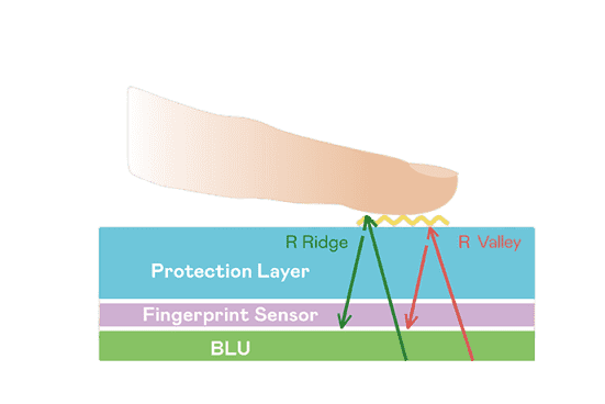 TFT 指纹扫描感测技术利用薄膜电晶体 (TFT) 当作光感测元件,,,,藉由非晶硅 (a-Si) 与低温多晶硅(LTPS)既有光电转换特性对不同波段光源进行吸收,,,使感测 IC 读取阵列感测元件的光漏电差异,,转换成数位灰阶影像。。